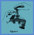 3. The guide base is seated on the scalp over the incision and the drill is inserted through the base. The tripod base must be held with all three legs firmly against the scalp. This ensures a perpendicular trajectory for the drill and subsequent perpendicular passage of the ventricular catheter. (Figure 3)