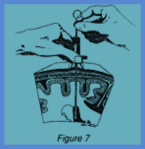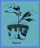 7. Position the catheter insert into the guide base. The insert should lock into the base prior to ventriculostomy. Keeping firm, even pressure of the guide base on the scalp, manually advance a ventricular catheter into the ventricle. Normally the intracerebral length is 5 cm in adults. The catheter depth at the scalp surface is approximately 8 cm. depending upon the variability in skull and scalp thickness. (Figure 7)